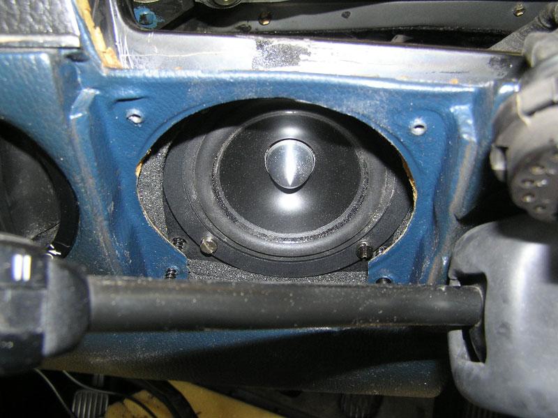 Gott sei Dank waren wir uns aber mit dem glücklichen Besitzer schnell einer Meinung: lediglich ein neues Radio sollte das hübsche Cockpit stören, mehr aber nicht! Also verbauten wir in die Werksöffnungen einen Tangband Breitbänder, schaffte ihm mit jeder Menge Dämmmaterial ein hübsches Plätzchen und entwickelte für diese Einbausituation einen passenden Hochpassfilter und Sperrkreis.
